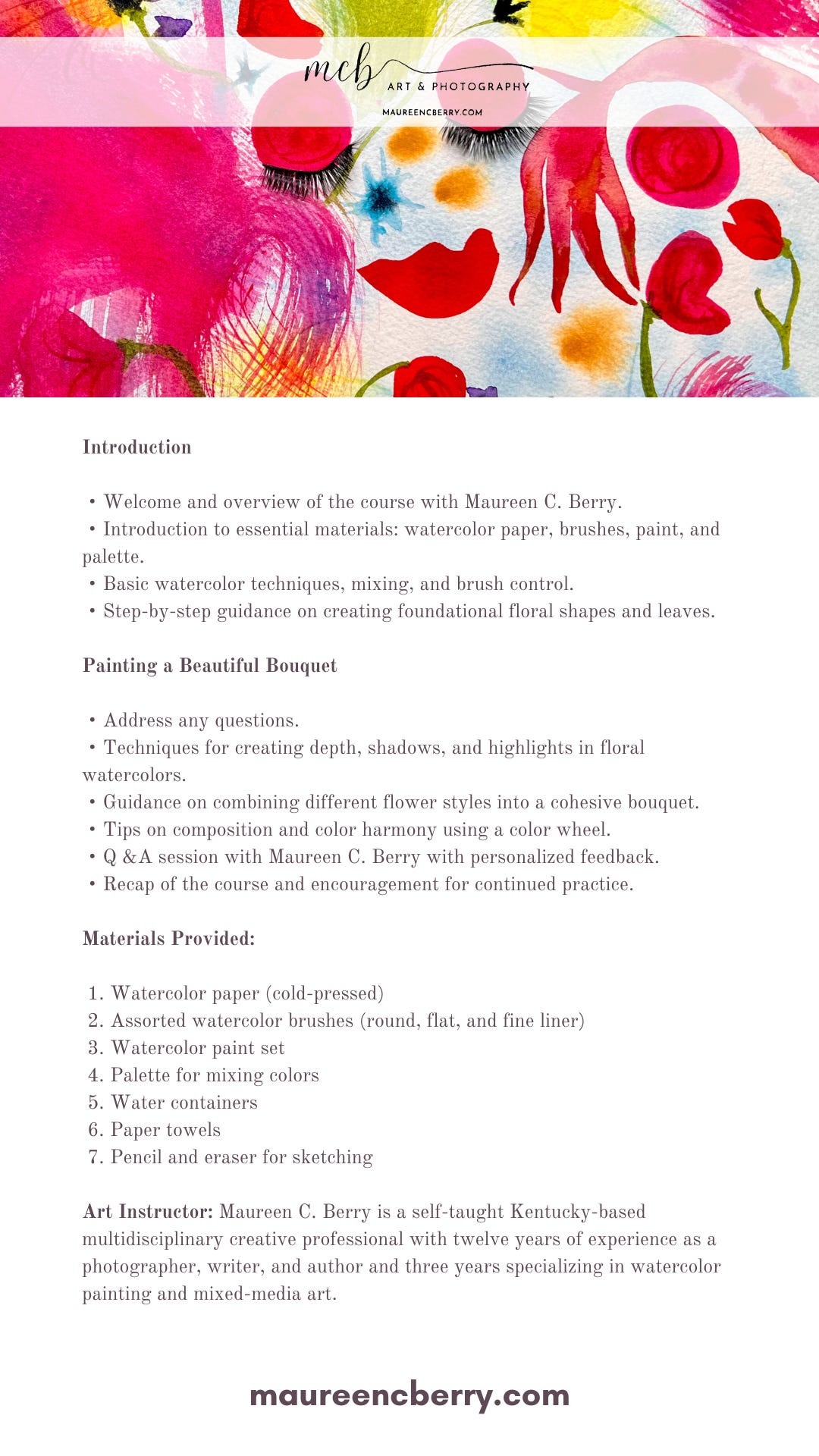 Registration for Beginner Watercolor Loose Florals will be through Mahr Park Arboretum, and more details will be forthcoming. Below is the course description. If you’re in the area, I hope you’ll join me. Eventually, I’ll offer an online course! Stay tuned for more information.