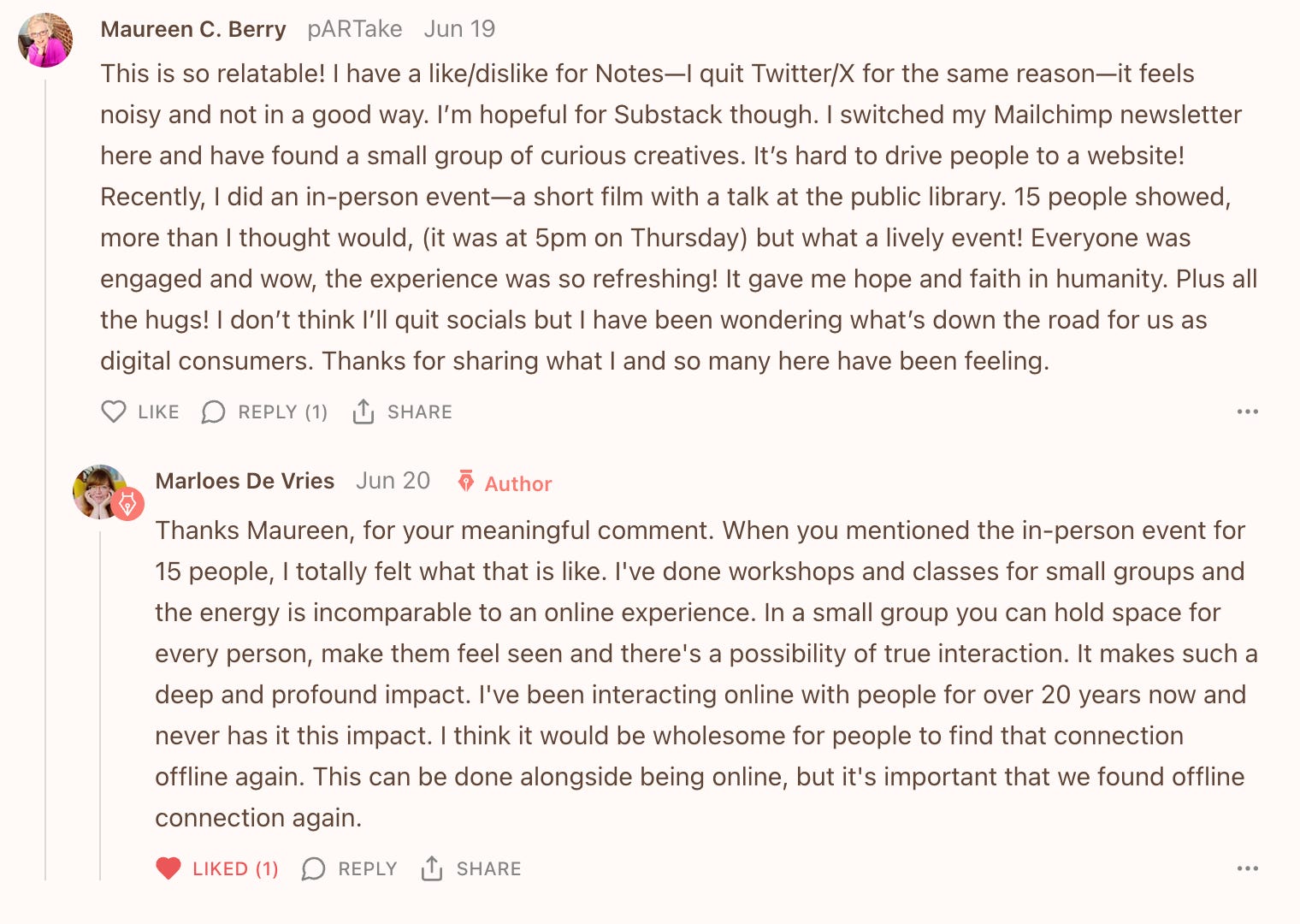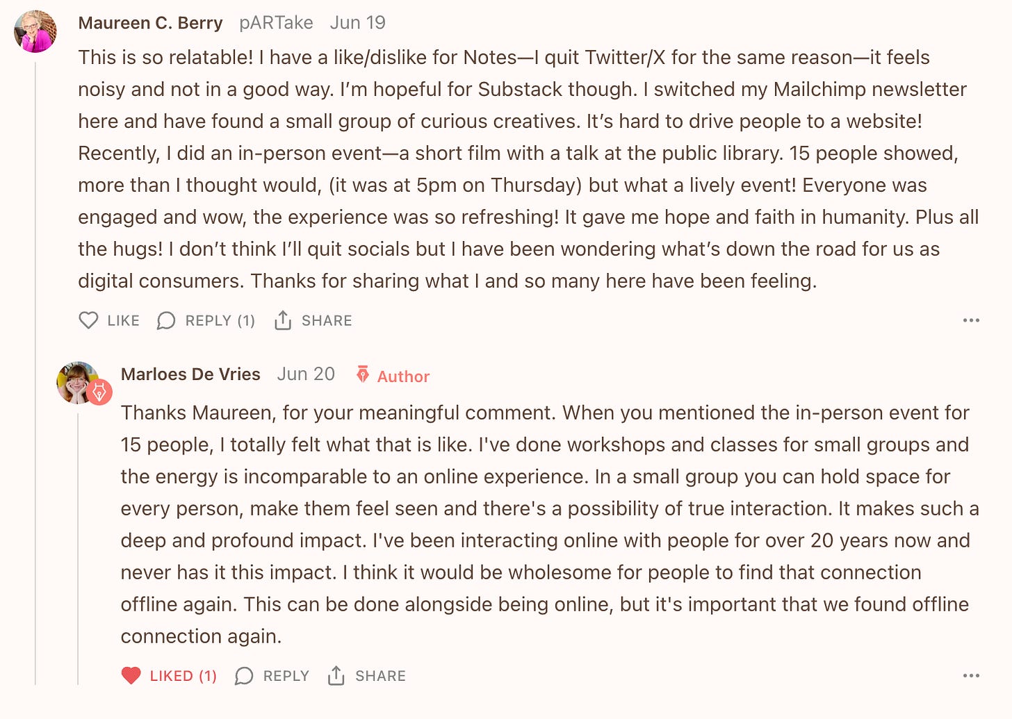 After reading Marloes De Vries’s essay, Is the end of social media near? She pulled many of the exact words she wrote directly from my brain, making me realize how much time I spend with my face on my noisy and addicting screen and how I miss human connection in real life. Our brief exchange is below.